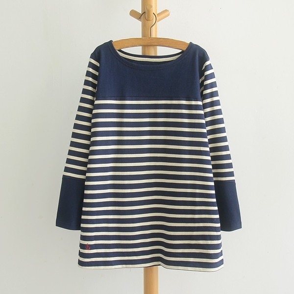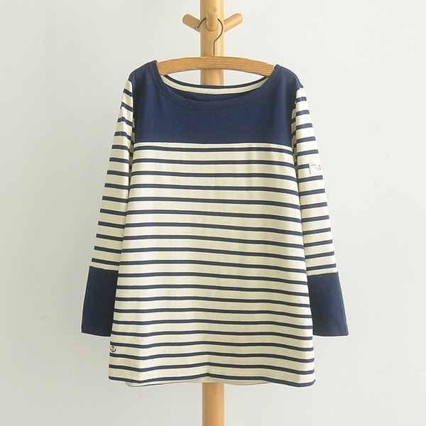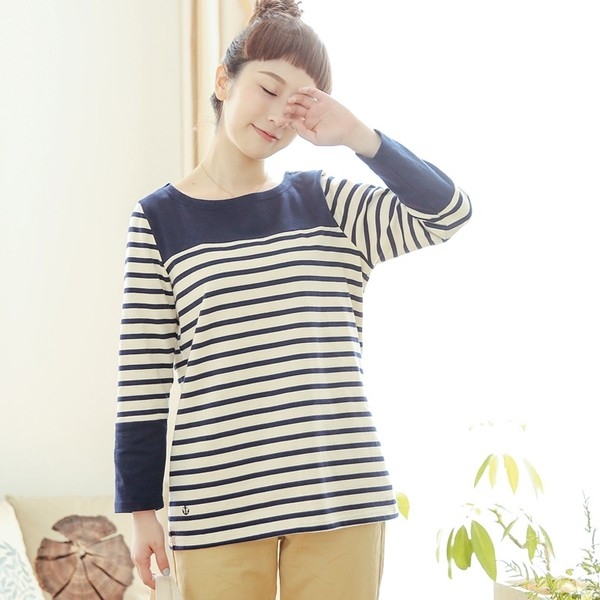 Áo sọc ngang cổ tròn phong cách Nhật Bản